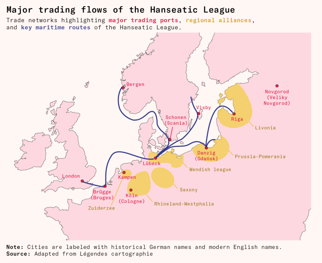 Without corporate structures, they built supply chains that distributed goods between Northern Europe’s major ports, with capillaries that spread into each city’s hinterlands. Without formal territory, their laws governed trading hubs spanning thousands of miles, from London all the way to Western Russia. And, despite being composed of hundreds of member cities, the Hanseatic League had no head of state. Yet the Hansa still managed to sign treaty after treaty with foreign rulers and, a few times, even fought (and won!) wars.