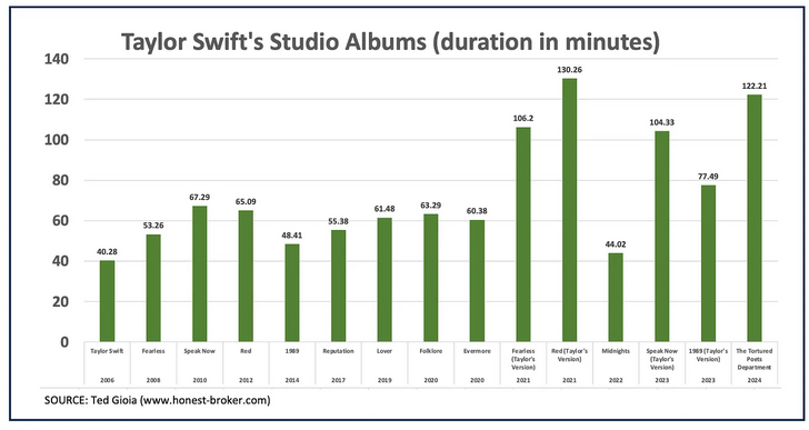 I’ve charted the duration of Swift’s studio albums over the last two decades, and it tells the same story. She has gradually learned that her audience prefers longer musical experiences.