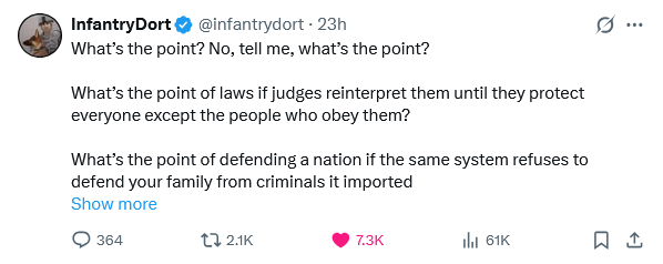 What’s the point of defending a nation if the same system refuses to defend your family from criminals it imported on purpose?