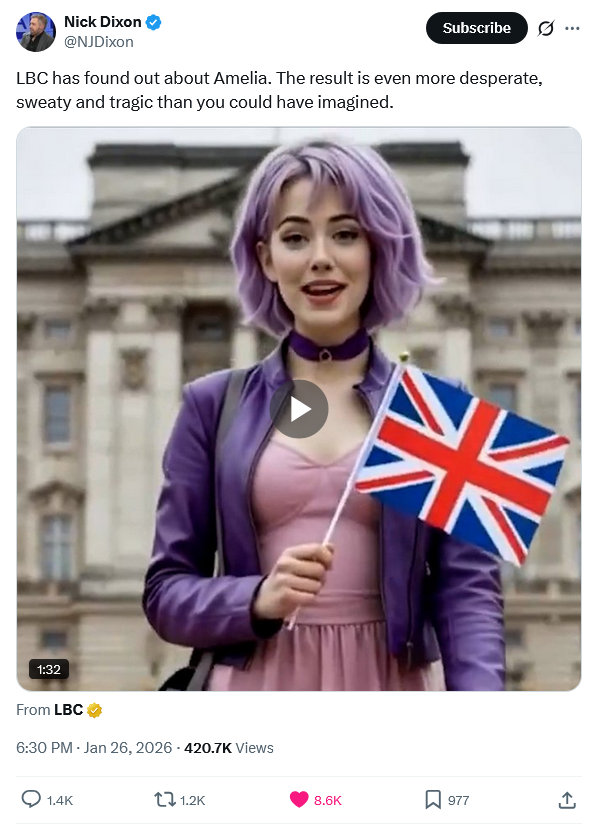 The Guardian introduces Amelia as a girl “who proudly carries a mini Union flag and appears to have a penchant for racism“, before lamenting the “plethora of increasingly sophisticated AI-generated iterations” of her, including “real-life” encounters between Amelia and movie characters, “accompanied by racist language and far-right messaging”.