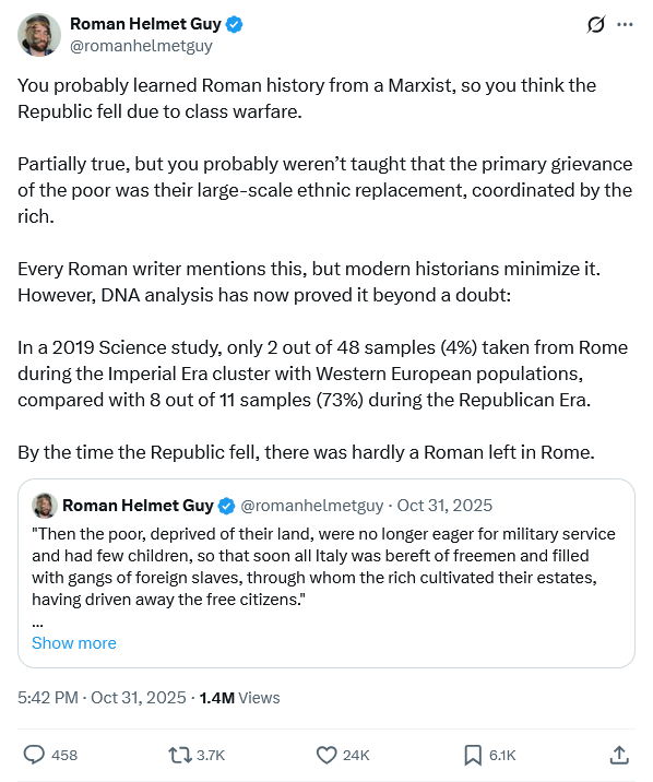 On the social media site formerly known as Twitter, Devon Eriksen responds to an older tweet about the replacement of “original” Romans during the Republic with other ethnicities over the course of the Empire: