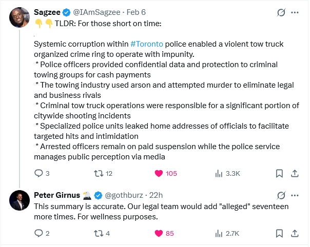 On the social media site formerly known as Twitter, Peter Girnus explains the recent arrest of several Toronto police officers on a disturbing variety of charges:
