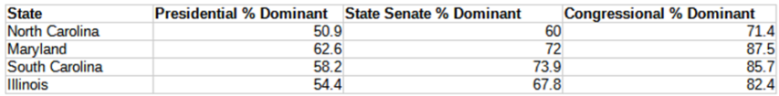So for example, in Republican-dominated North Carolina, 50.9% of people voted Trump, 60% of state senate seats are held by Republicans, and 71.4% of their House seats belong to Republicans. The state senate (50 seats) is only half as gerrymandered as the House delegation (14 seats).