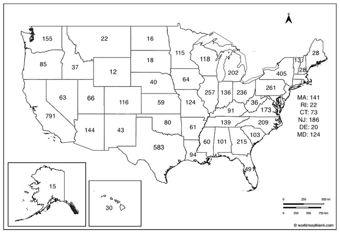 The US is far bigger than in the Framers’ time, so it’s the 50,000 number that would apply in the present day. This would increase the size of the House of Representatives from 435 reps to 6,6412. Wyoming would have 12 seats; California would have 791. Here’s a map: