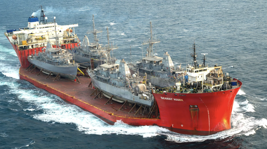 Four decommissioned U.S. Navy Avenger class mine countermeasures ships have left Bahrain on what may be their final voyage aboard a larger heavy lift vessel. Avengers had been forward-deployed to the Middle Eastern nation for years, where critical mine countermeasures duties have now passed to Independence class Littoral Combat Ships (LCS).