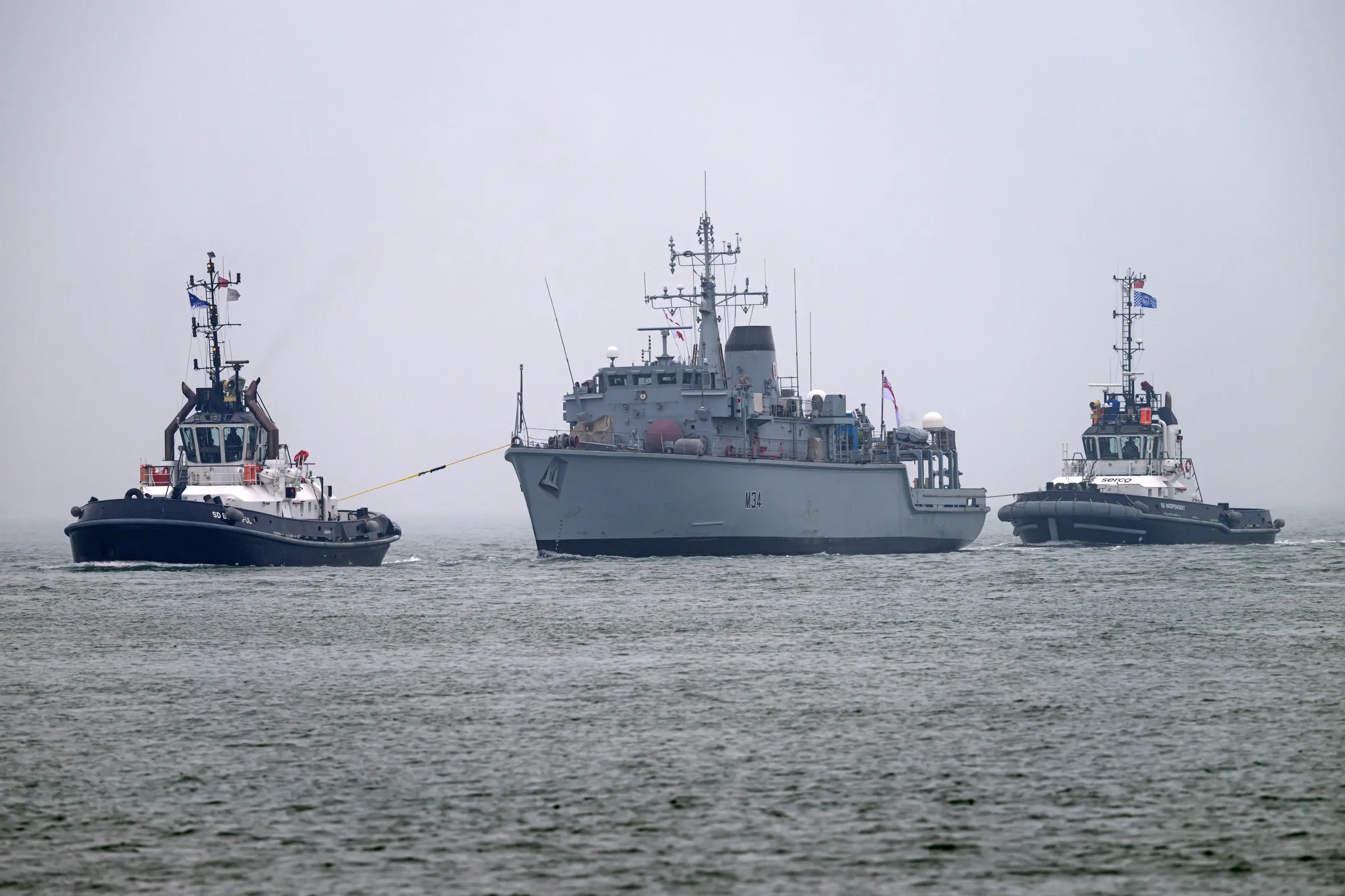 Battered and unseaworthy, HMS Middleton was dragged by tugs into Portsmouth naval base on Sunday.