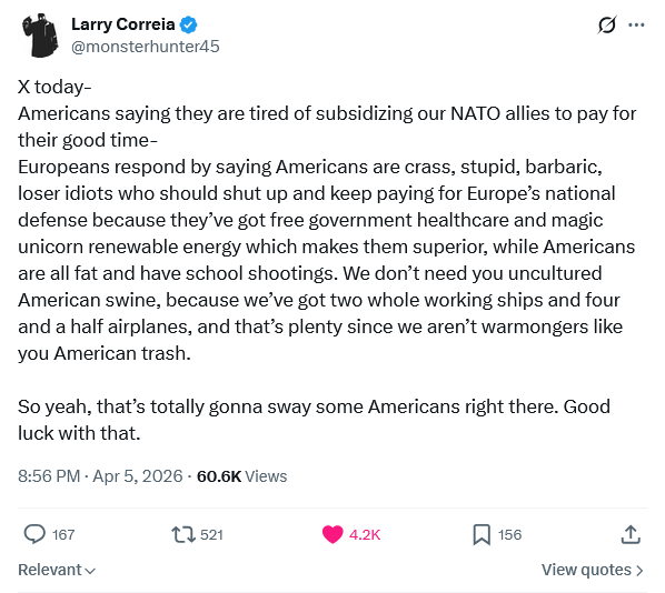 Then Europeans stopped keeping the contempt private. They started saying it to our faces. In their media. In their parliaments. At every international forum. “Americans are stupid. Americans are violent. Americans are a threat to democracy.”