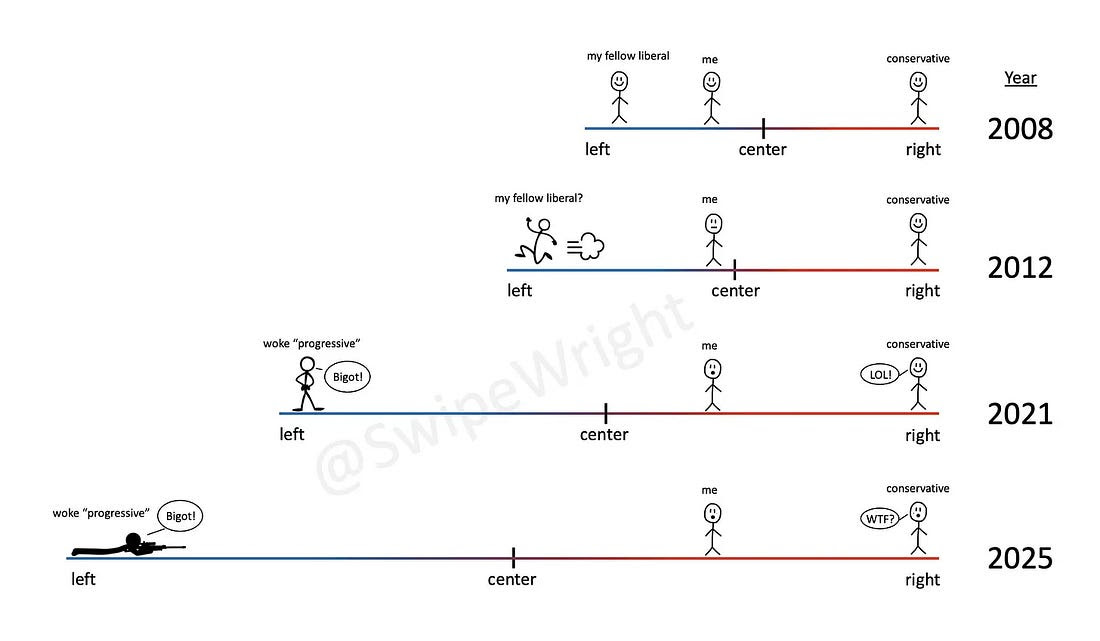 That happens to me all the time, by the way. I am – as far as I can tell, both by where I place on surveys and by what I can distinguish when looking left or right – about one third of the way from true center to the right, or, in other words, just on the right edge, the cusp, between the middle third and the right third. And I am vociferous to and past the point of being obnoxious about it, too. This is why much of the extreme right – the right so far from them that lefties cannot even distinguish it from conservatives – detests me as a liberal, while liberals see pure and unrepentant Nazi.3