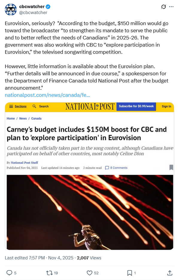 However, on the ludicrous side, the feds want to spend money to “investigate” Canada taking part in the freaking Eurovision contest: