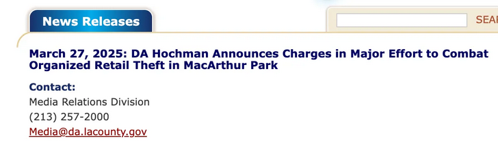 “This case is an important step toward cleaning up MacArthur Park, a community that has long struggled with crime and safety concerns,” District Attorney Hochman said. “Combating organized retail theft in close partnership with LAPD and other law enforcement is a priority for my administration. My office will vigorously prosecute this case and send an unmistakable message to criminals: Retail theft will not be tolerated under my watch.”