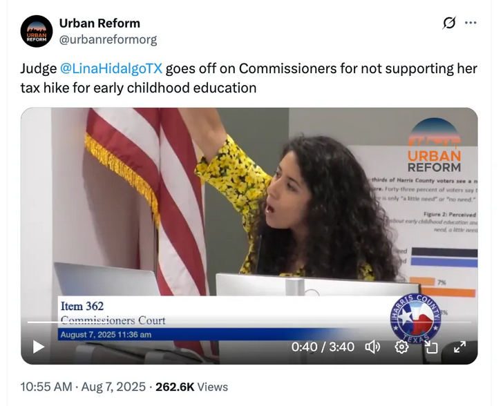 This topic is back on my mind this week because of Lina Hidalgo, though a county of five million people may be a bad example of real localism and neighborhood authority. Hidalgo is the county judge — in Texas, the chief executive officer — of Harris County. And she’s mad as a hatter. Click on the link to watch the video, but a tax increase is “not about politics, it’s about kids.” Never heard that one before.