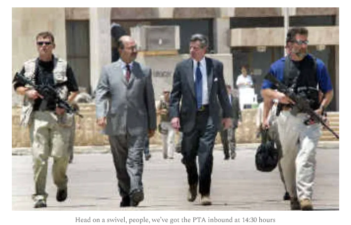 Making appalling decisions at the head of broken institutions, they respond to criticism by hiring men with guns as a shield against ordinary human contact. Like I said, the mayor is down the block, mowing his lawn, so you can wave to hi—STOP RIGHT THERE, GET ON THE GROUND.