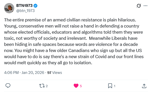 Returning to a topic I’ve been mocking all week on the socials, in The Line, Matt Gurney gently suggests to the Canadian government that it’s just not reasonable to expect Canadian civilians to wage some kind of fierce guerilla war against a feared American invasion while actively disarming Canadians who legally own guns: