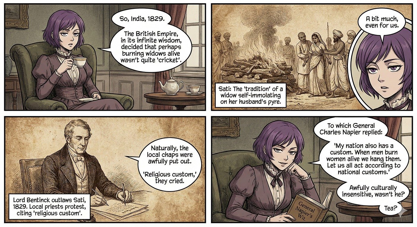 “Be it so. This burning of widows is your custom; prepare the funeral pile. But my nation has also a custom. When men burn women alive we hang them, and confiscate all their property. My carpenters shall therefore erect gibbets on which to hang all concerned when the widow is consumed. Let us all act according to national customs.”