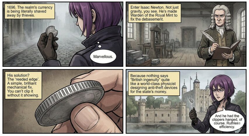 Newton recalled every coin in the country. Melted them all down. Reminted them with a reeded edge – ridges along the rim that made clipping instantly visible.