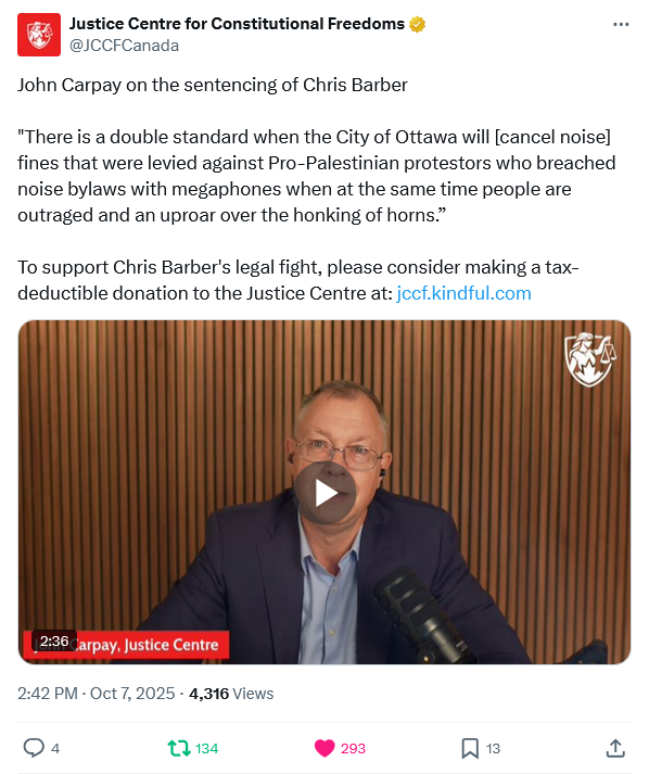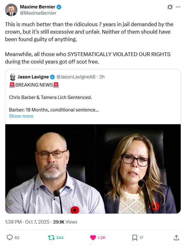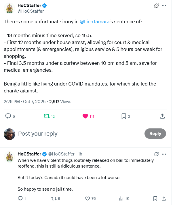 The convoy leaders, Lich and Barber, […] finally learned their fate in an Ottawa courtroom on October 7th, 2025, almost four years since the trucks first rolled into the capital, and over two years since their trial began on September 5, 2023. Rather than the unwarranted and what can only be described as vindictive prison terms sought by the Crown, Justice Heather Perkins-McVey instead sentenced them both to conditional non-custodial sentences of 18 months. A decision, one can be sure, the Crown is not pleased with and one that is nothing short of humiliating given it falls farther short from the seven and eight year terms they argued for than they could have possibly imagined.