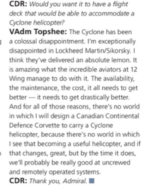 Cyclone isn’t a new helicopter. It’s a product of 1990s requirements, from a contract signed twenty years ago. It still has yet to reach its final Block 2.1 state. I get why it’s frustrating to everyone. I’m glad Topshee said the quiet part out loud. Call them what they are.