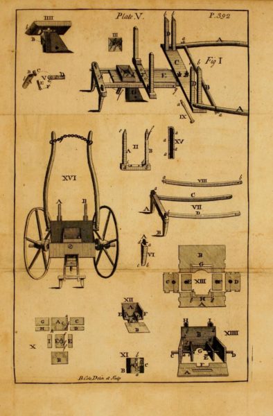 Illustration of a seed drill from Horse-hoeing husbandry, 4th edition by Jethro Tull, 1762 (original work 1731).
