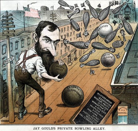 “Jay Gould’s Private Bowling Alley.” Financier and stock speculator Jay Gould is depicted on Wall Street, using bowling balls titled “trickery,” “false reports,” “private press” and “general unscrupulousness” to knock down bowling pins labeled as “operator,” “broker,” “banker,” “inexperienced investor,” etc. A slate shows Gould’s controlling holdings in various corporations, including Western Union, Missouri Pacific Railroad, and the Wabash Railroad.