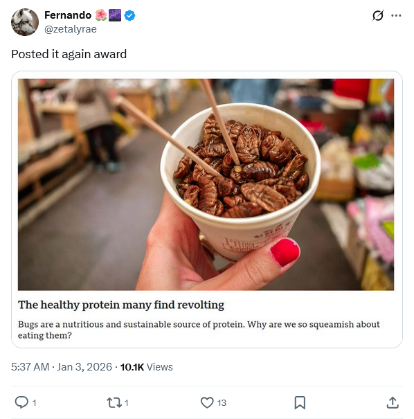 On the social media site formerly known as Twitter, ESR reacts to yet another “bugs are yummy, peons, you are going to eat them” post: