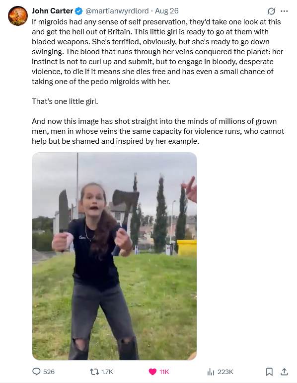 At least, the headline expresses how the sky people probably frame the situation where a young girl felt she needed to scare off a threat to herself and her friend. This is from an X post which claims to be describing what actually happened rather than what the media has been reporting: