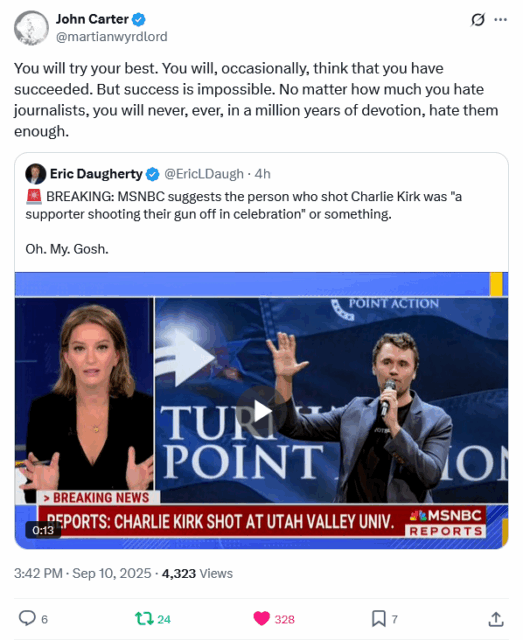 No sooner did news of Kirk’s shooting hit the Internet, than the lying media was spreading doubt about the incident and heaping scorn upon the victim. Perhaps the shooter had been a supporter, one talking head suggested, and had been firing his rifle in celebration … it was all a big accident, and that’s just what you get for supporting the Second Amendment. Other journalist scum were at pains to emphasize that Kirk was divisive, polarizing, controversial … implying that if he’d just been a good boy and said what all the other good boys are supposed to say, he would have been safe. Getting shot in the throat is just what you get for speaking out of turn, so shut your mouth, bigot.